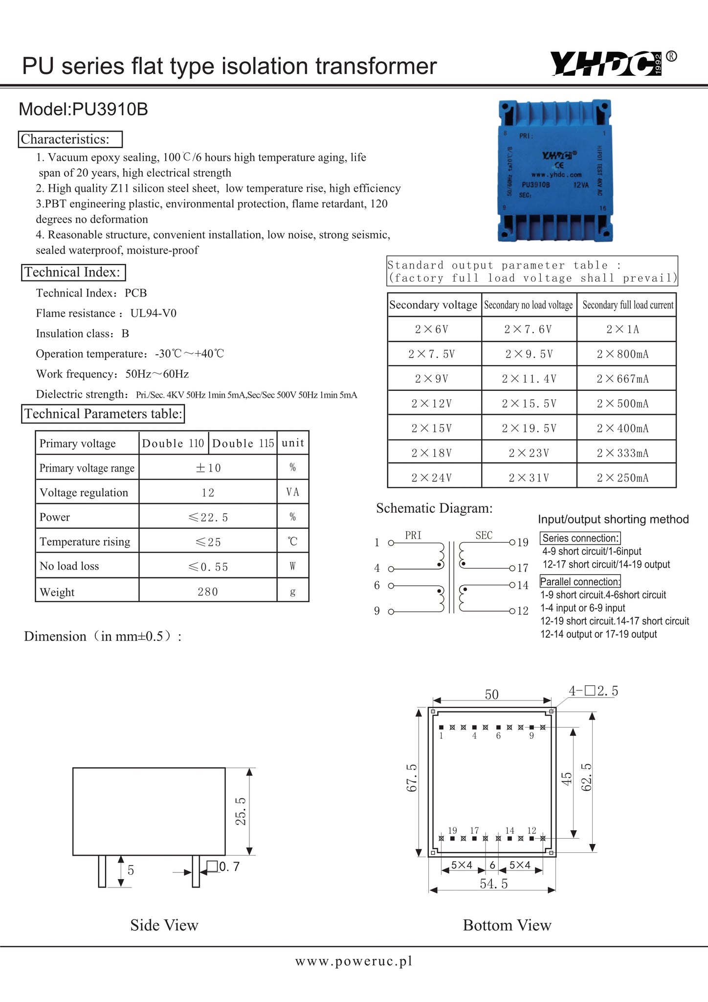 PU series flat type isolation transformer PU3910B 110V×2/115V×2 12VA