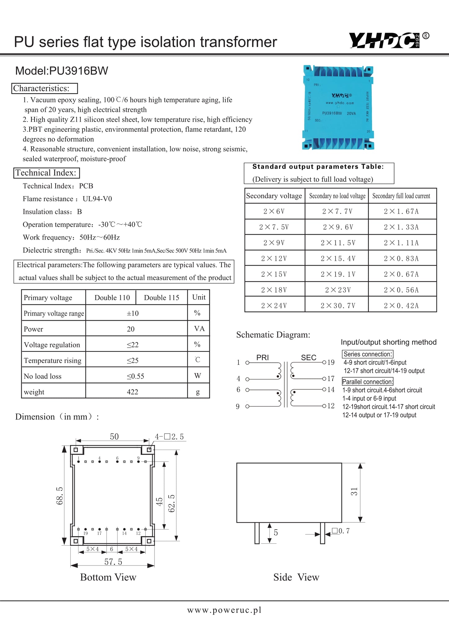PU series flat type isolation transformer PU3916BW 110V×2/115V×2 20VA