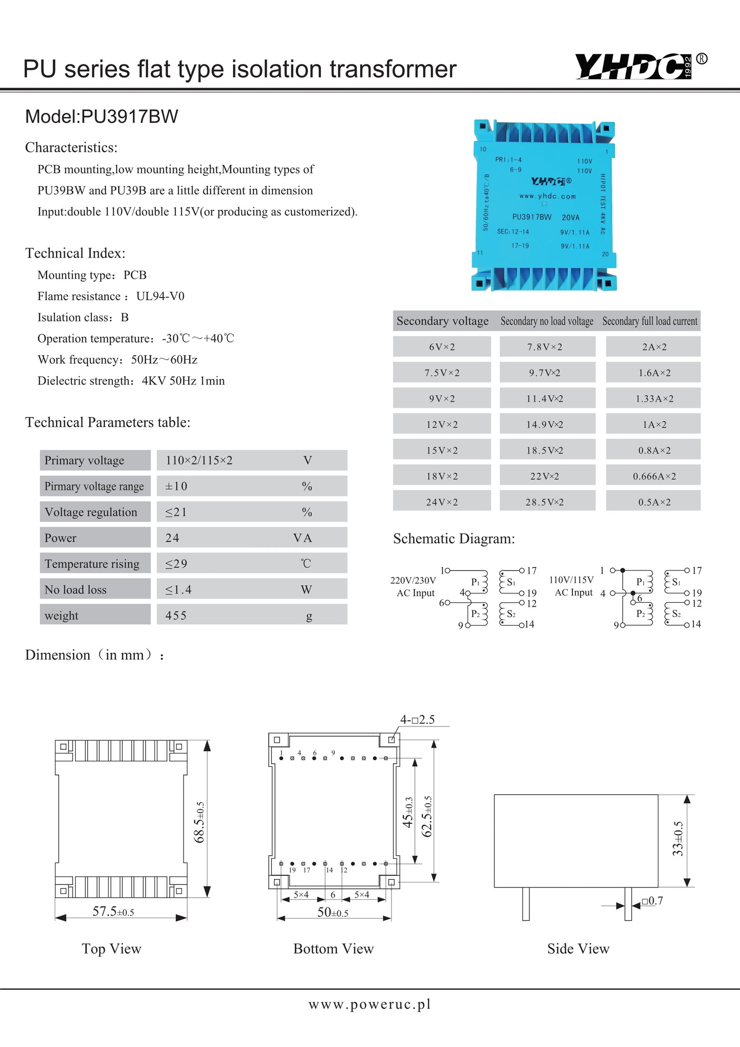 PCB mounting , low mounting height , Mounting types of PU39BW and PU39B are a little different in dimension lnput:double110V/double 115V(or producing as customerized)