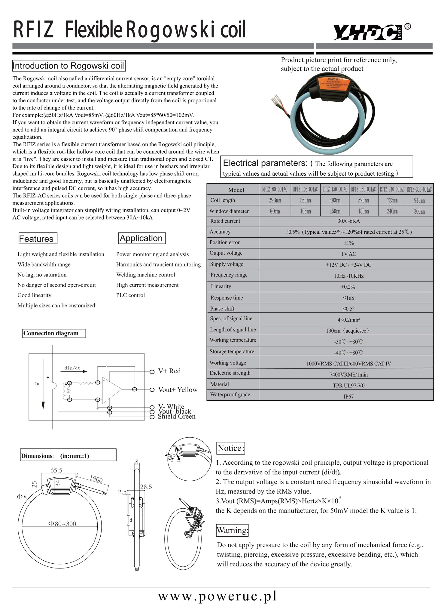 Rogowski coil RFSY Rated current 30A-500KA output voltage 50mV/kA@50Hz 60mV/kA@60Hz