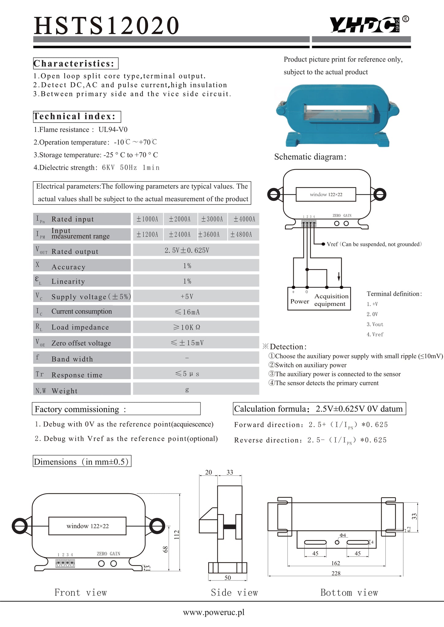 Split core current sensor HSTS12020 Rated input ±1000A ±2000A ±3000A ±4000A Rated output 2.5V±0.625V Supply voltage(±5%) +5V