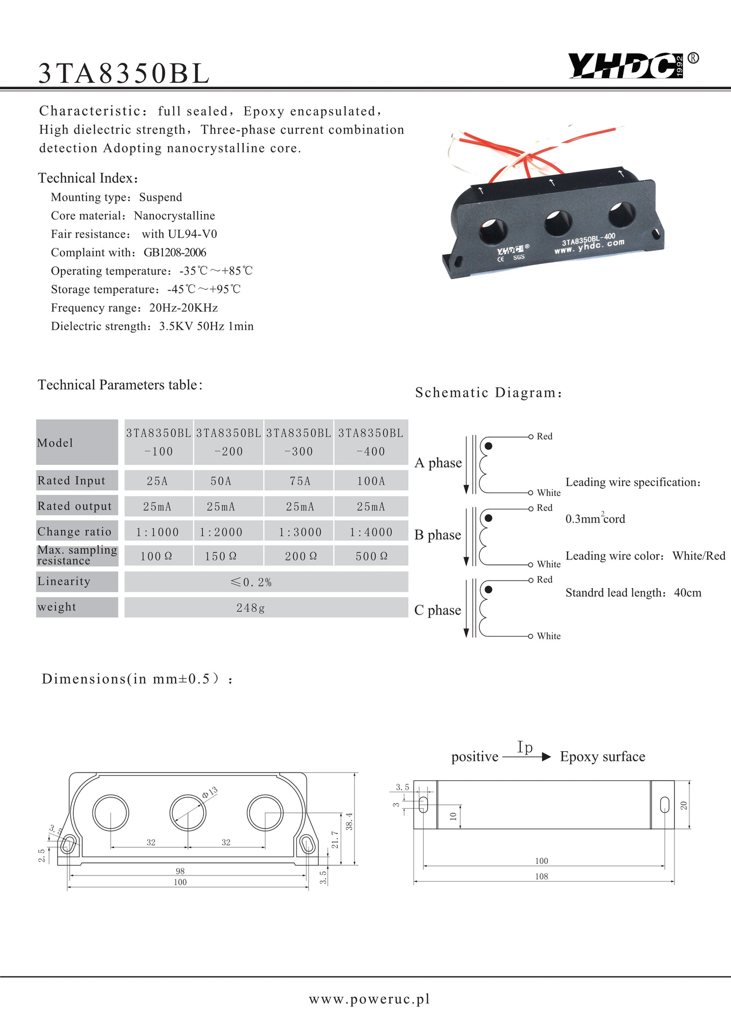 full sealed,epoxy encapsulated,high dielectric strength, three phase current combination detection,adopting nanocrystalline core.