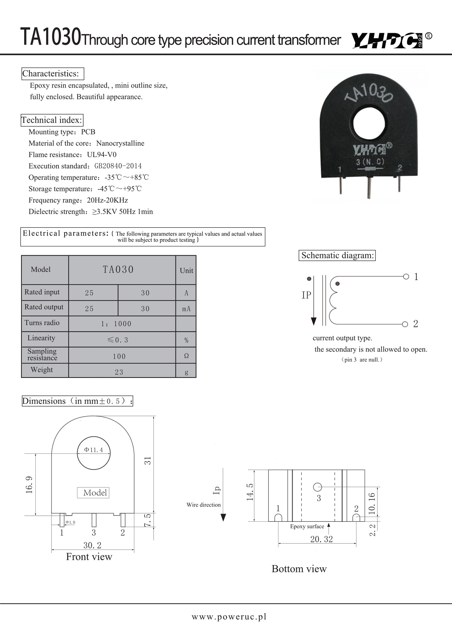 Through core type precision current transformer TA1030 Rated input 25A/30A Rated output 25mA/30mA