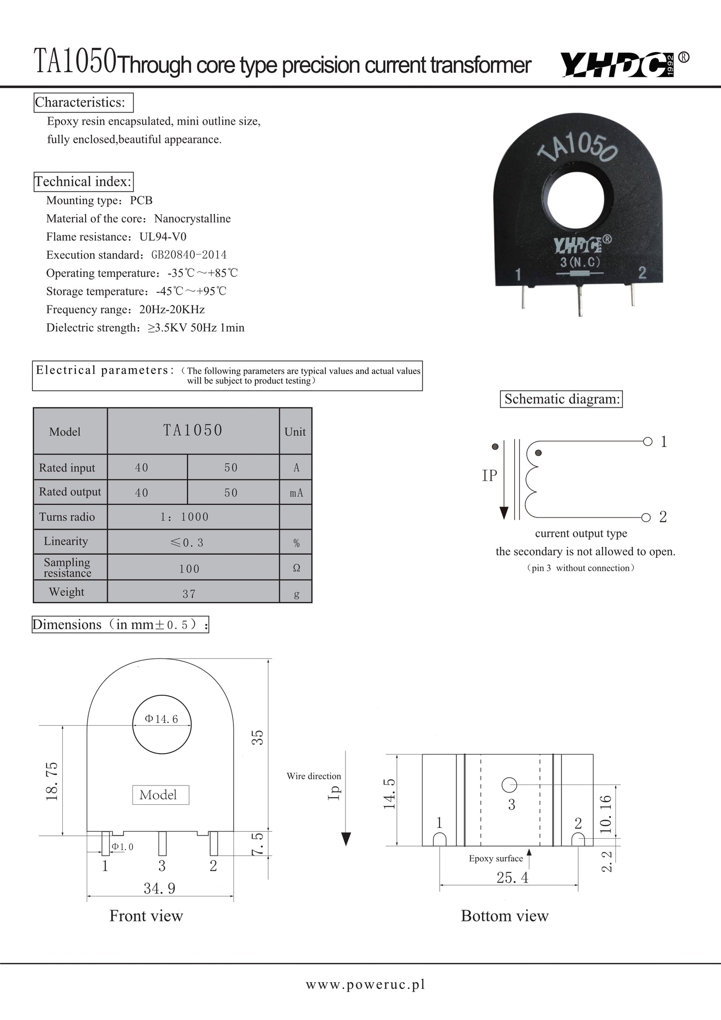 Through core type precision current transformer TA1050 Rated input 40A/50A Rated output 40mA/50mA