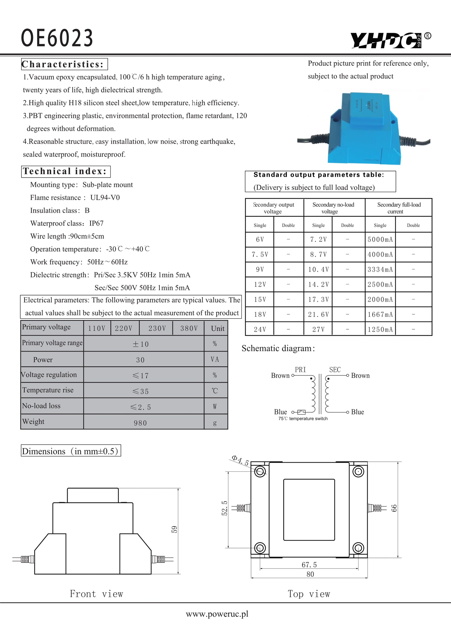 Waterproof transformer OE6023 Power 30VA Primary voltage 110V/220V/230V/380V Secondary output voltage 6V/7.5V/9V/12V/15V/18V/24V