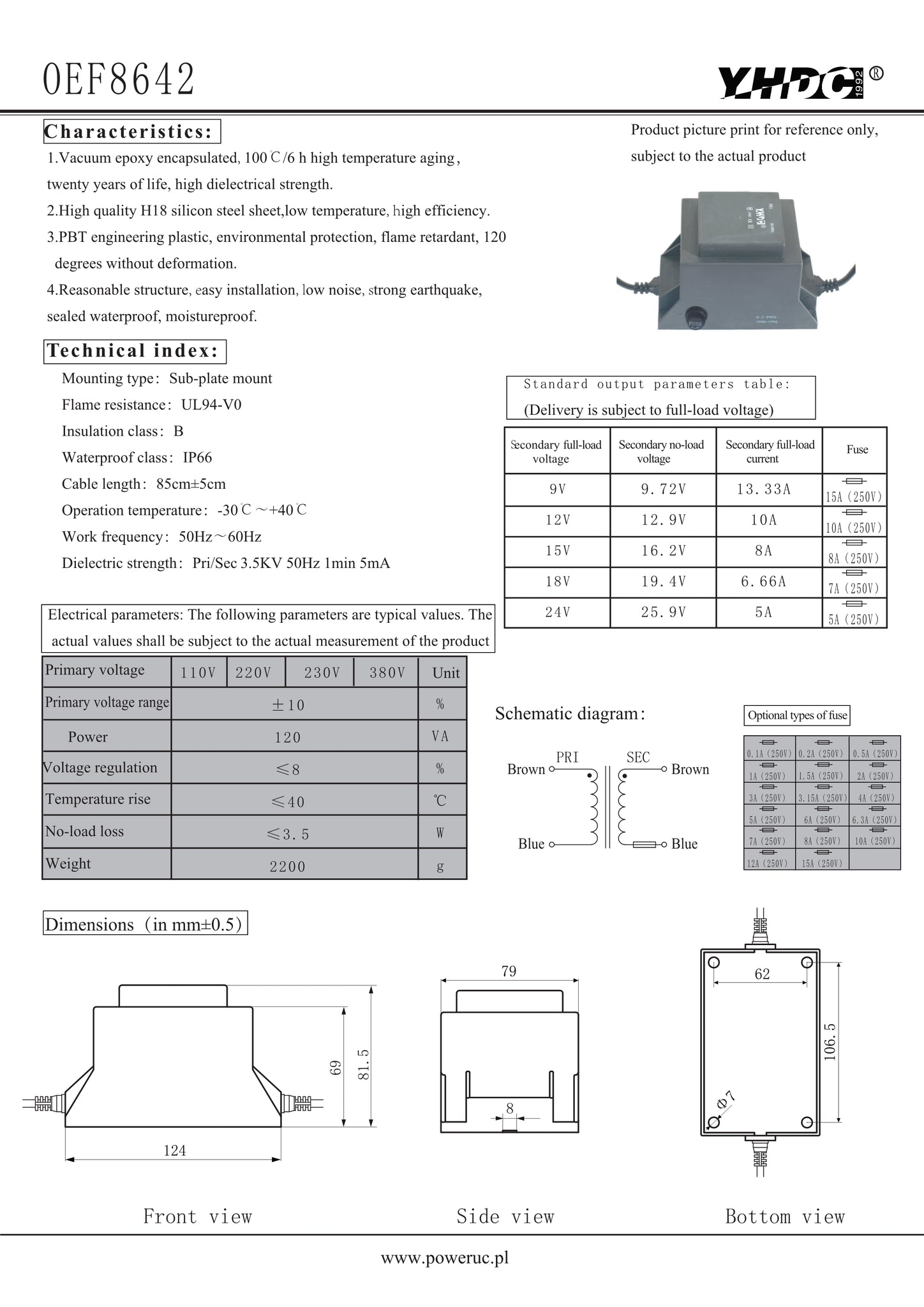 Waterproof transformer OEF8642 Power 120VA Primary voltage 110V/220V/230V/380V Secondary output voltage 9V/12V/15V/18V/24V